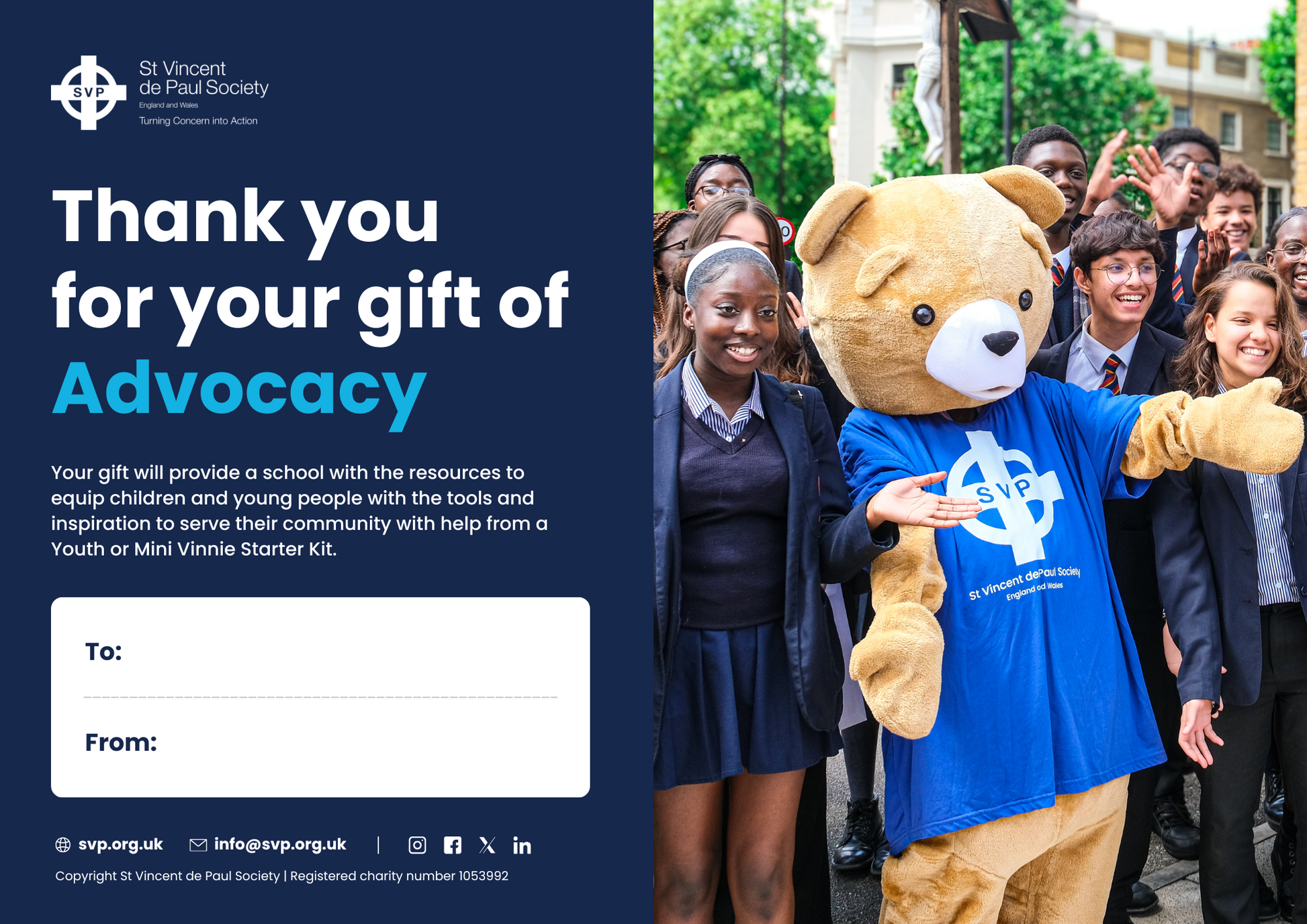 Your gift of £20 helps ensure children and young people are given the chance to serve others with hope and compassion. Through a Youth or Mini Vinnie Starter Kit, schools receive the resources to guide students as they learn the value of working together, caring for their neighbours, and building stronger communities for the future.